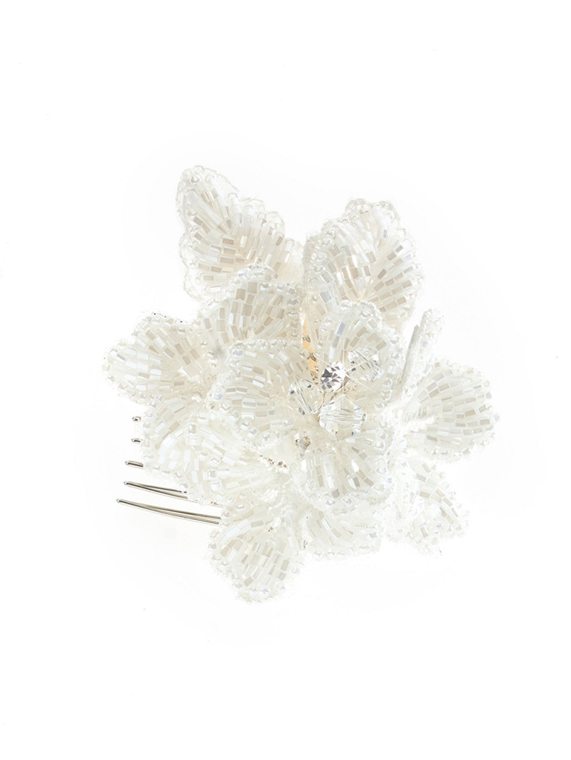 Komposition: silberfarbener Haarkamm, Blumen- und Blattformen aus elfenbeinfarbenen Kristallen und Perlen
