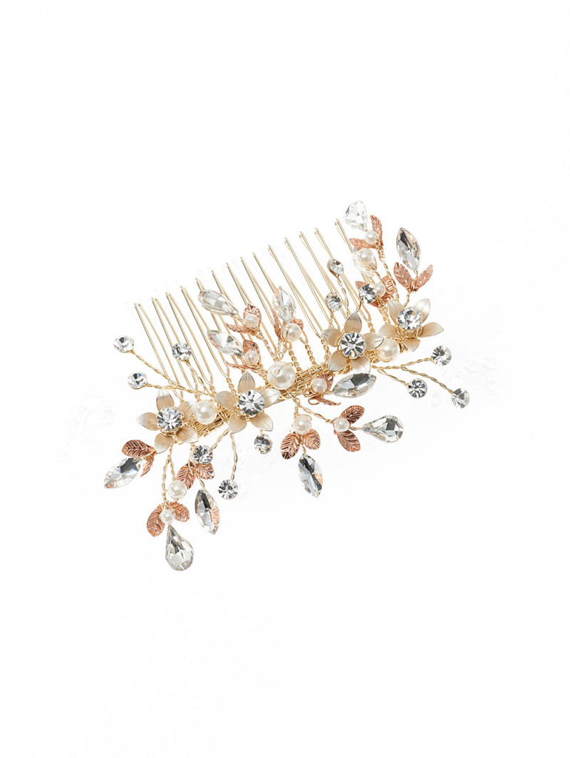 - Wenn Sie als Braut Romantik bis ins kleinste Detail Ihres Hochzeitsoutfits implementieren möchten, wählen Sie dieses besondere Schmuckstück. Dieses goldfarbene Haarjuwel auf Kamm hat rosagoldfarbene Blätter, perlmuttfarbene Blumen mit Strass und elfenbeinfarbene Perlen. Sie können diesen Haarschmuck auf verschiedene Arten in Ihre Hochzeitsfrisur integrieren.
