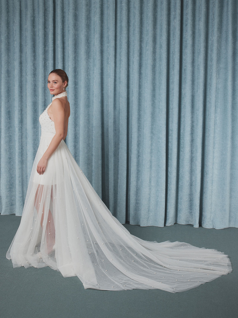 • Elfenbeinfarbener Überrock aus 2 Lagen Tüll aus der Poirier Collection.