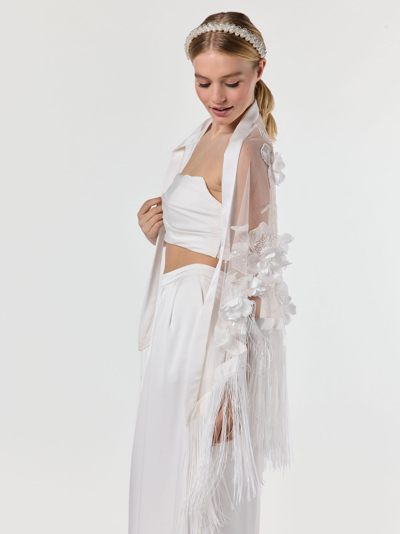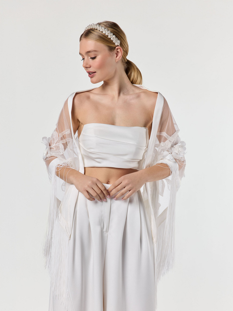 - Elfenbeinfarbene Tüllstola in dreiecksform mit gestickten 3D-Blumen aus der Poirier Collection.