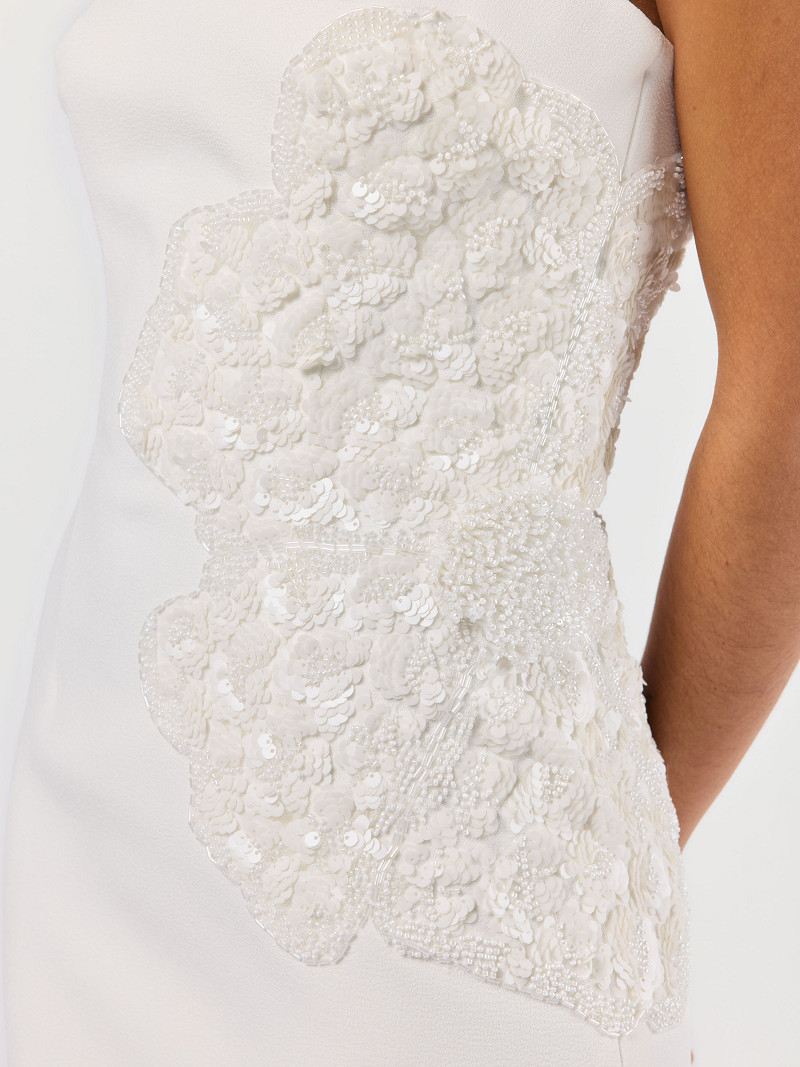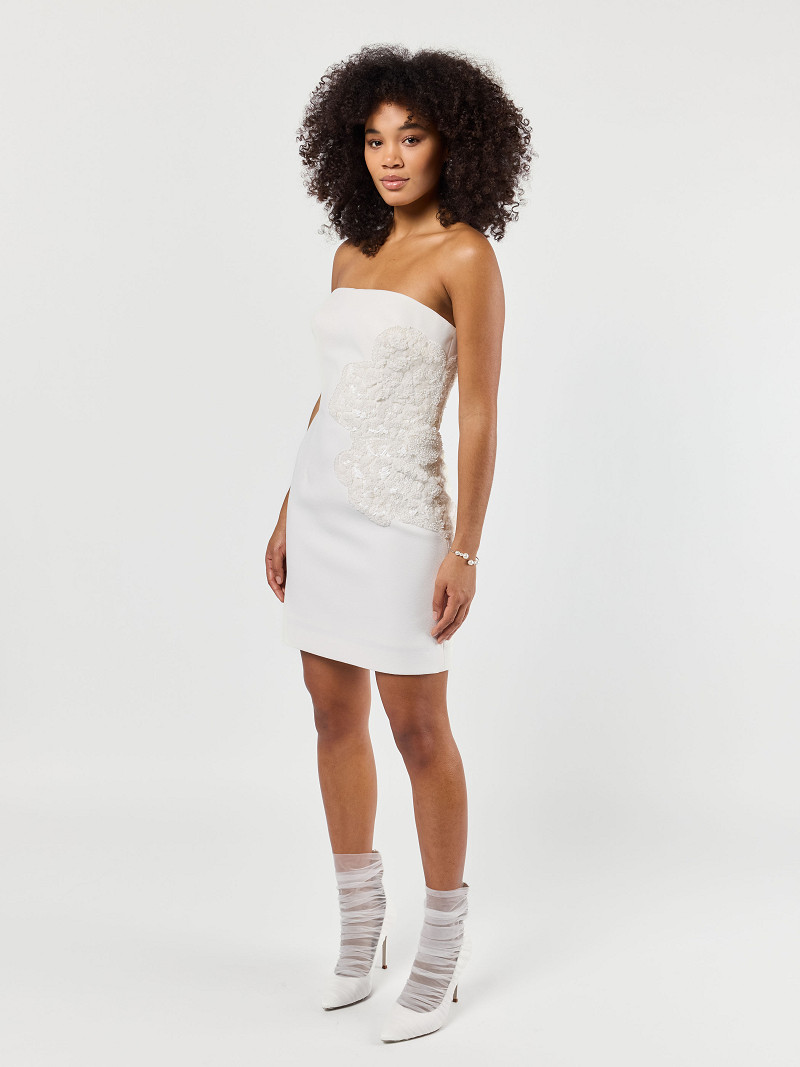 - Trägerloses Minikleid aus elfenbeinfarbener Blasen-Crêpe aus der Zinnia-Linie der GEM Collection.