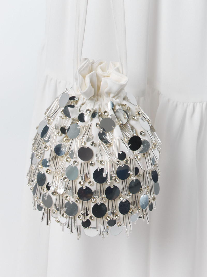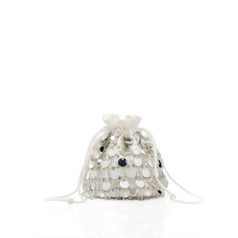 - Ivory-coloured satin handbag (drawstring pouch) from the Kate line of the GEM Collection.