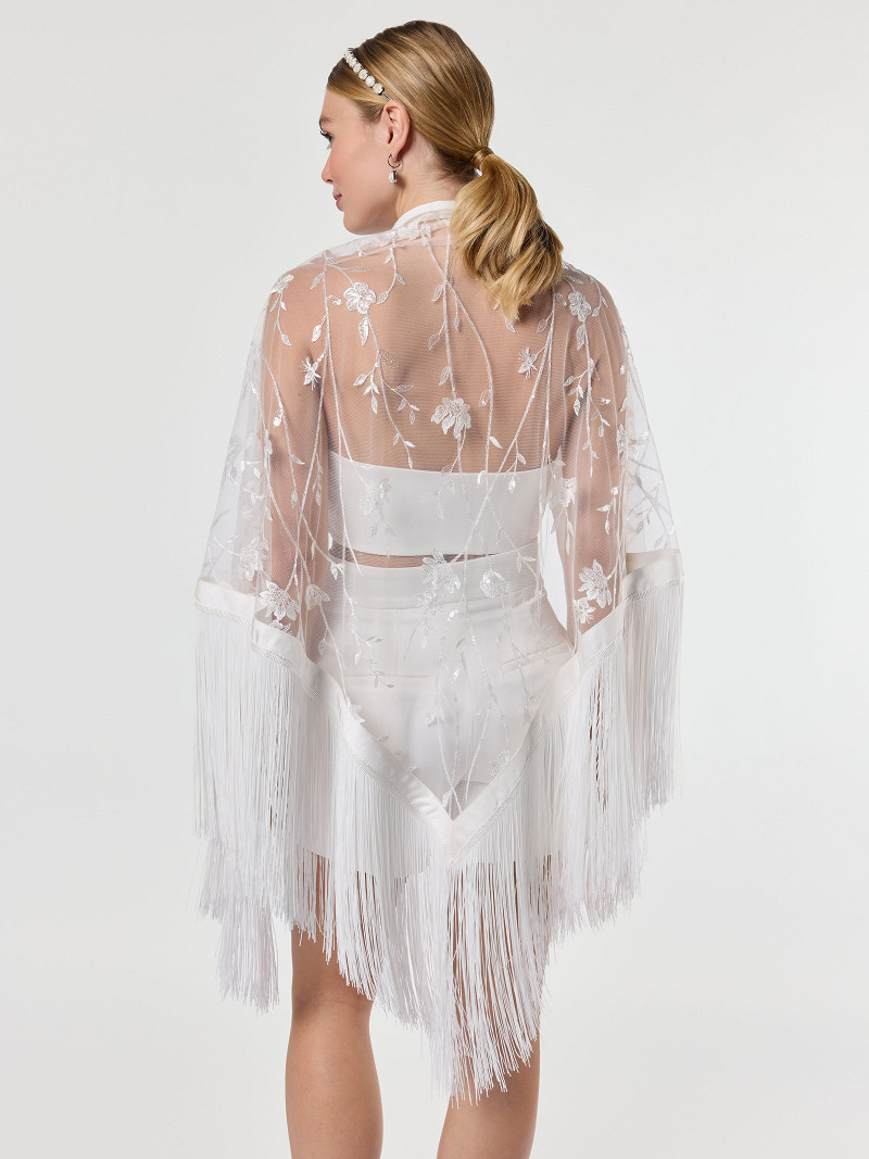 - Triangular-shaped tulle stole with embroidered flowers from the Poirier Collection.