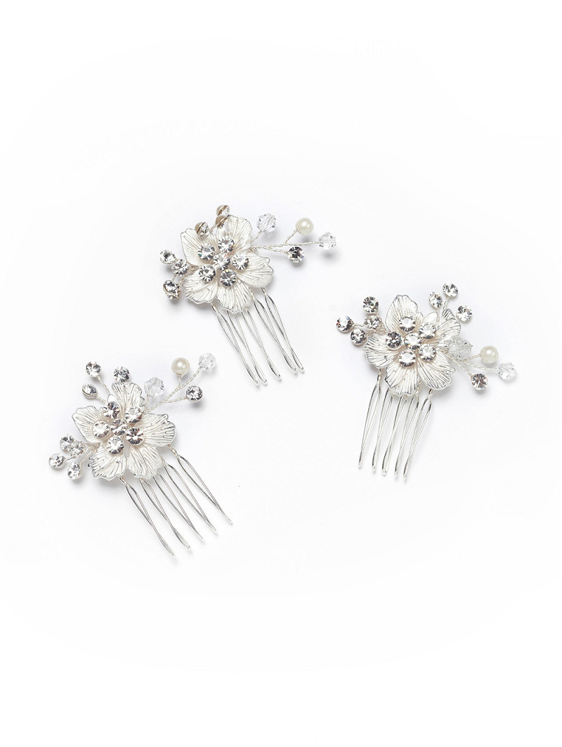 - Estos 3 peines decorativos tiene los siquientes elementos: 3 de color dorado O 3 flores de color plateado, que están decoradas con piedrecitas strass de color marfil, y perlas. Puedes usar estos peines de muchas maneras diferentes, tanto cuando su cabello está recogido o suelto durante su gran día
