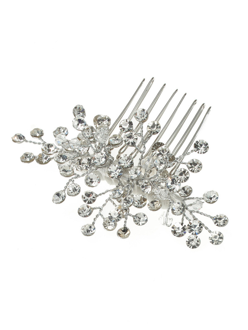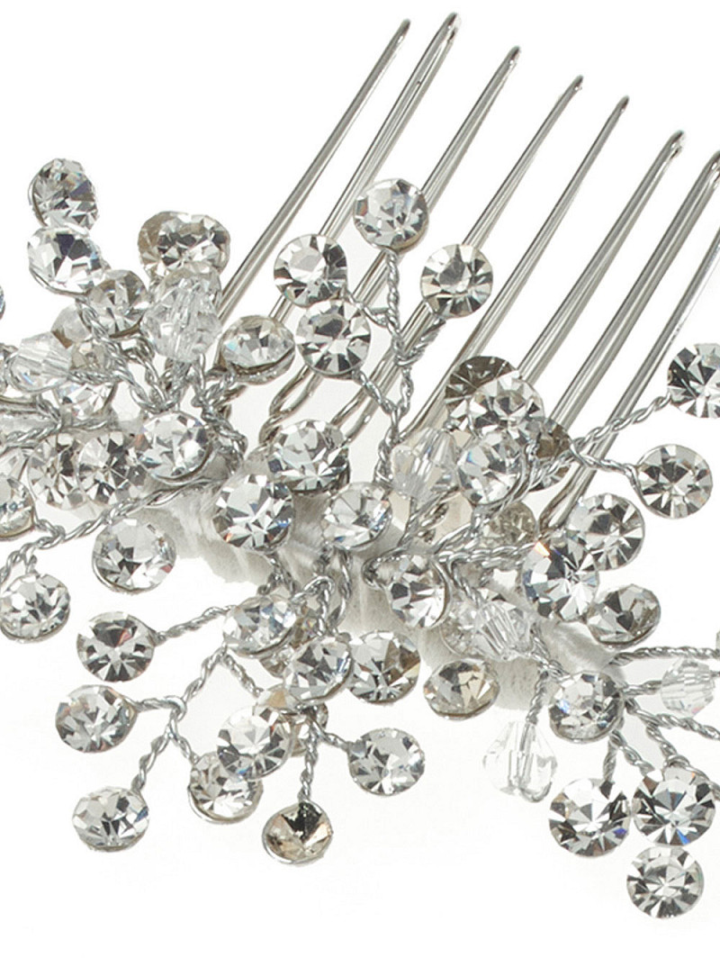 - Esta joya para el cabello de color plateado en peine es definitiva, porque tiene la forma de una ramita con una lluvia de pedrería. Brilla toda la noche con estas joyas para el cabello verdaderamente hermosas de Poirier y date un look de boda que recordarás durante mucho tiempo junto con tu próximo. Esta pieza de joyería se puede usar de múltiples maneras en el aspecto del cabello de su boda.