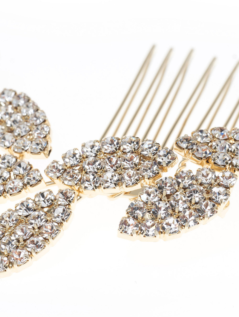 - Joya para el cabello de color dorado o plateado en forma de hoja con pedrería en peine