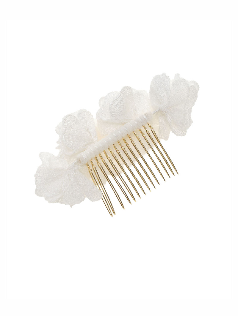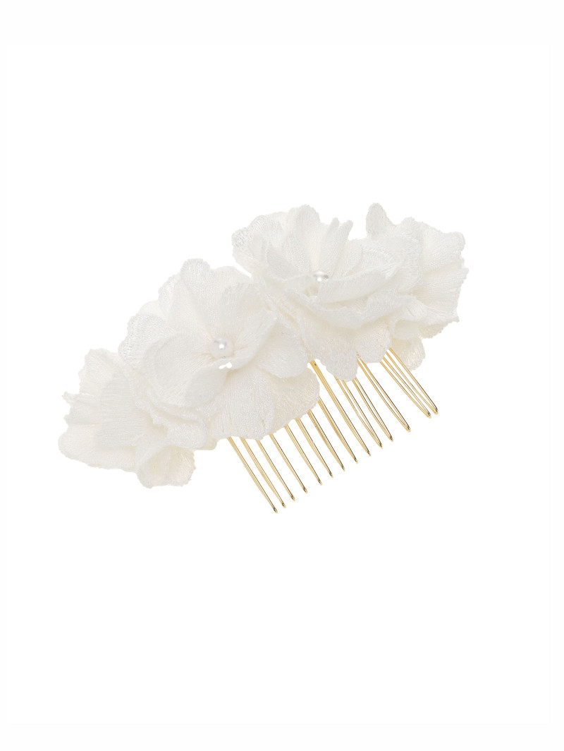 - Peineta dorada con flores de tela y perlas.