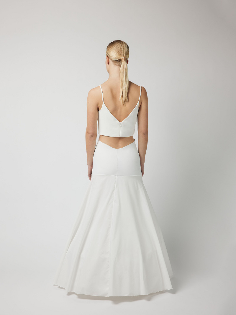- La parte alrededor de la cadera está confeccionada con un tejido diseñado especialmente: corrige la figura y es fácil de cortar para crear un escote profundo en la espalda o, si hace falta, para ajustar la longitud del cancán.