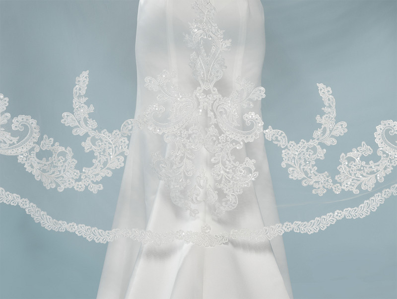 - Velo de color marfil de tul suave con lujosos bordados de encaje y lentejuelas