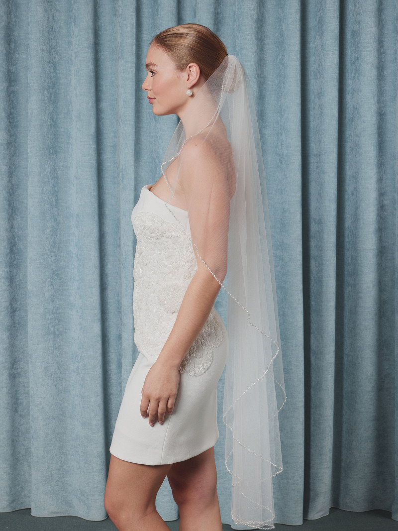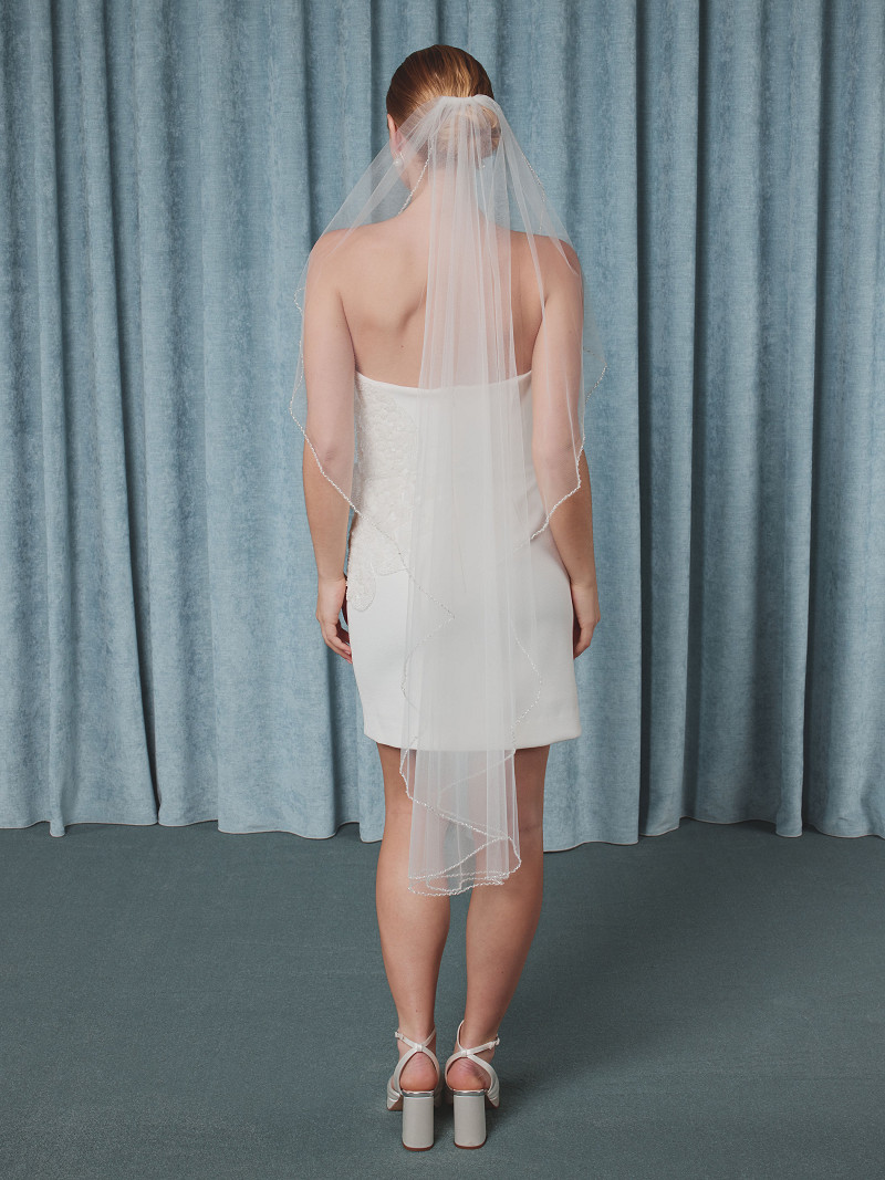 - Velo hecho de tul medio de color marfil de una sola capa de la Poirier Collection.