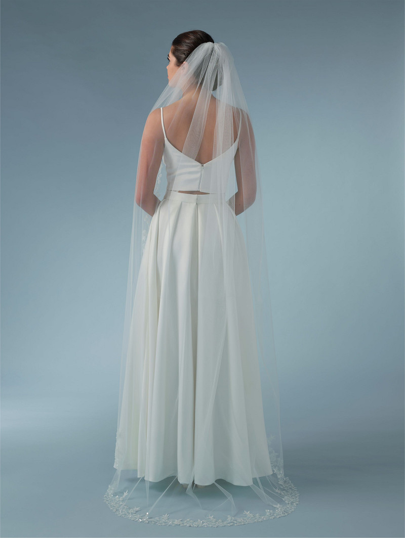 Velo de una capa de tul medio adornado con un motivo de flores creadas con lentejuelas en el borde | Longitud: 210 cm