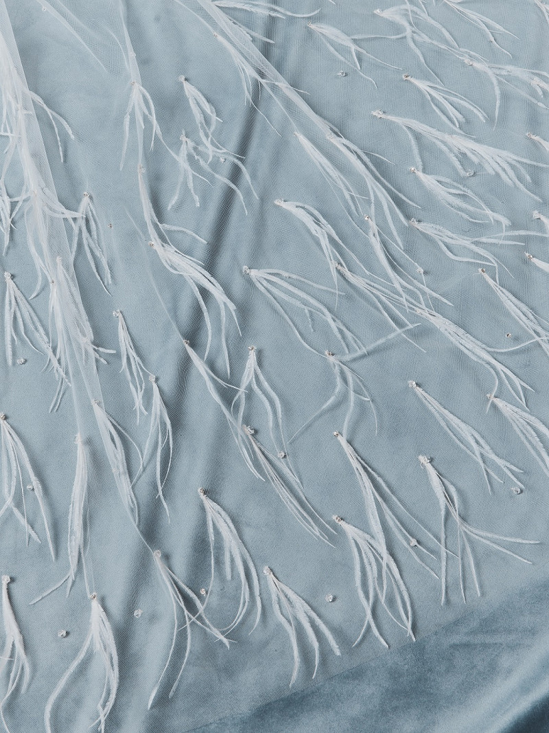 Velo de una capa de tul medio enteramente adornado con strass, y con plumas en la parte inferior | Versión de lujo | Longitud: 210 cm