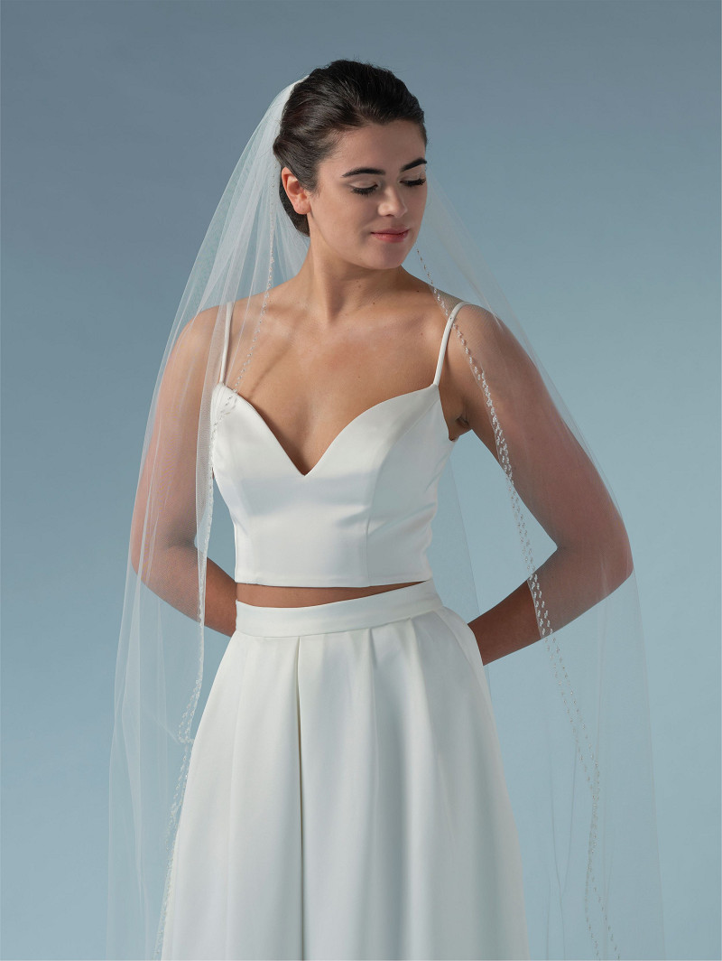 Velo de una capa de tul suave adornado con cuentas y cristales en el borde | Longitud: 210 cm | Disponible en varias longitudes