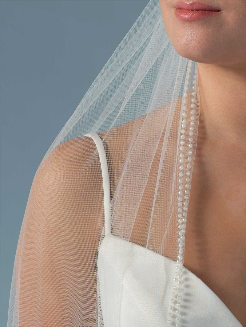 Velo de una sola capa de tul suave color marfil con doble hilera de perlas en el borde | Longitud: 210 cm | Disponible en varias longitudes