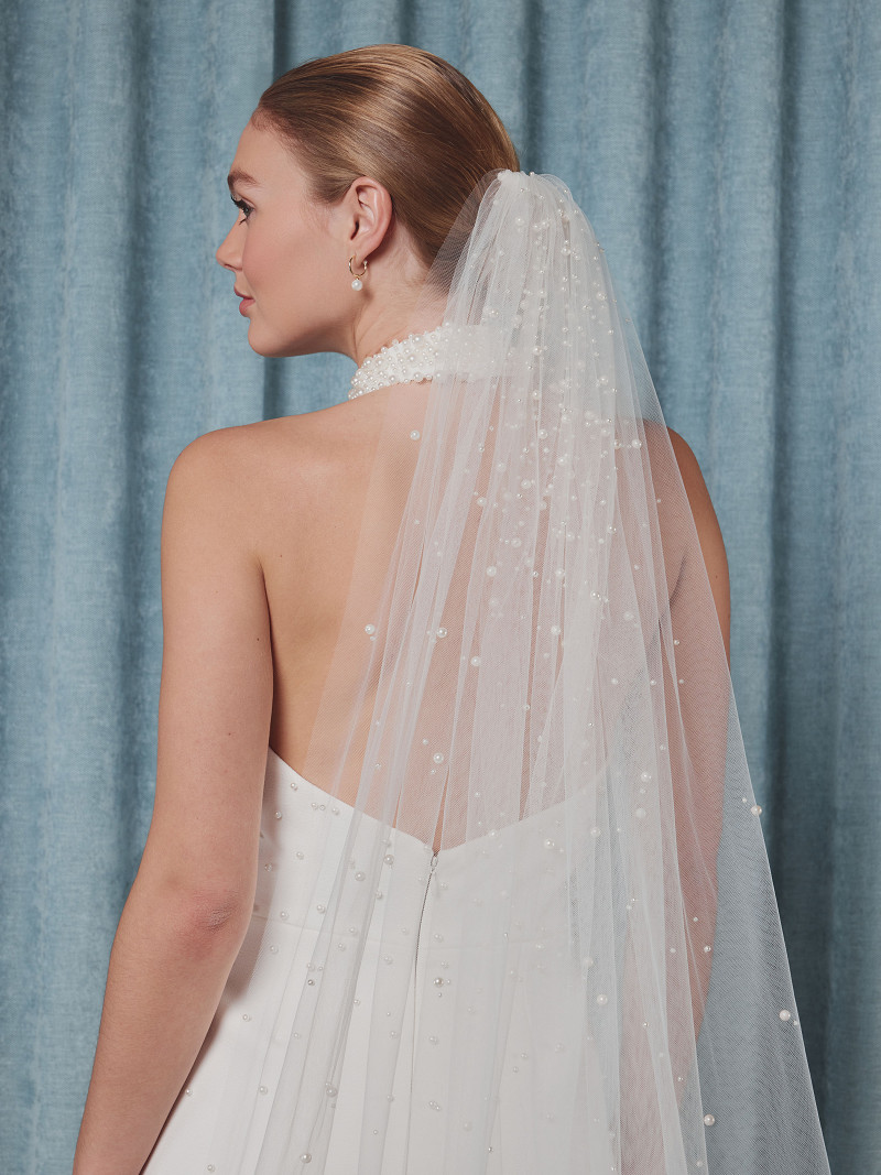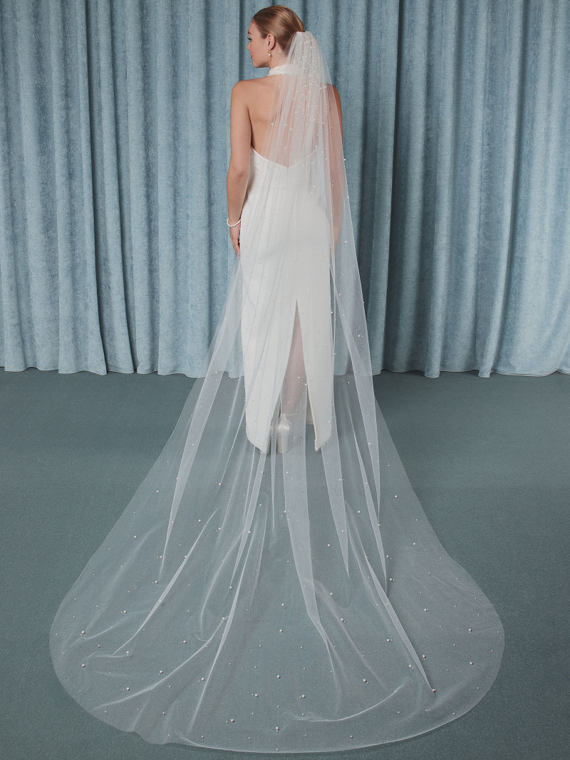 Velo monocapa, abundantemente decorado con perlas de diferentes tamaños
