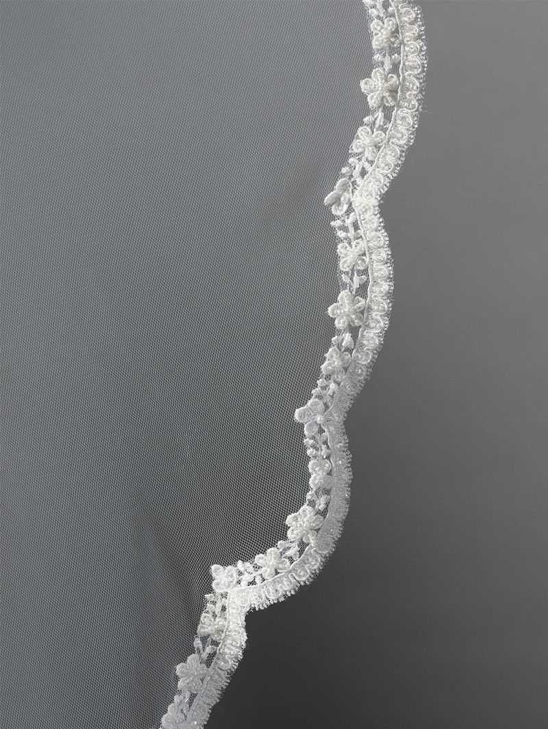 Velo de una capa de tul suave, con estrecho acabado festoneado de encaje decorado con perlas y lentejuelas. Longitud 280 cm.También disponible en otras longitudes.
