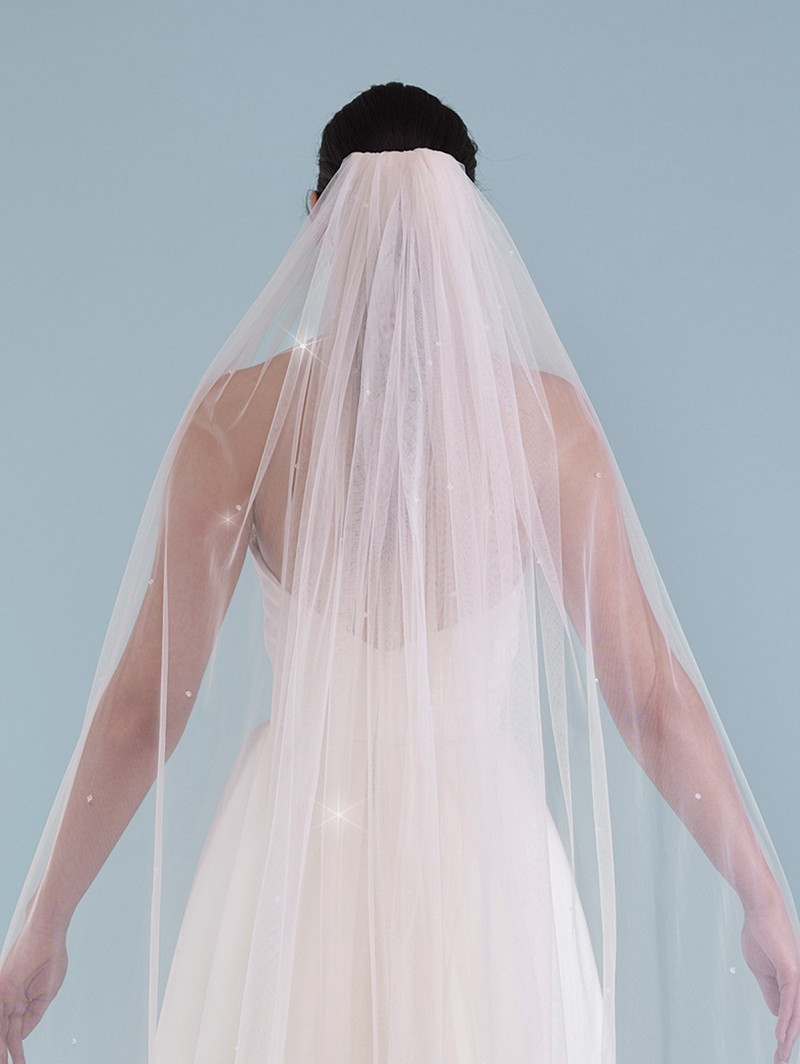 - Características: velo de novia de una sola capa de tul suave, cristales