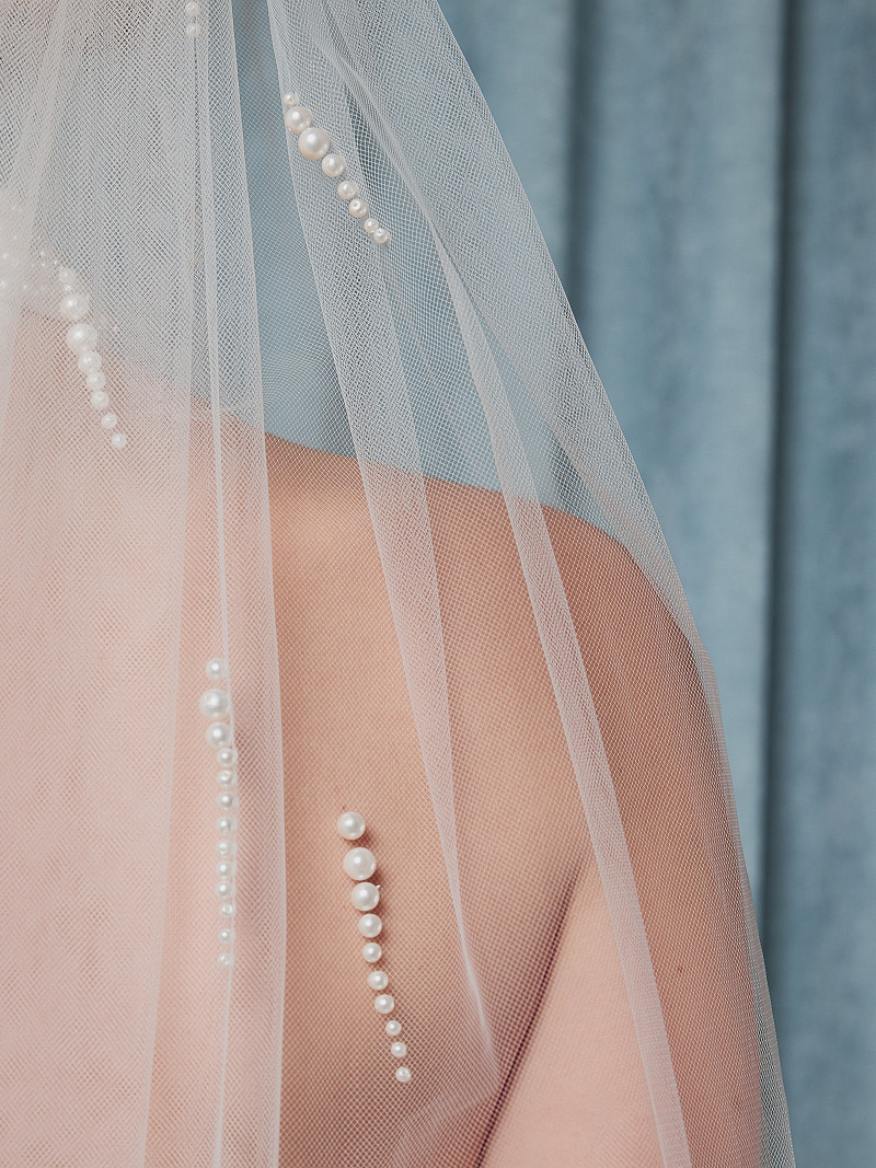 - Velo hecho de tul medio de color marfil de una sola capa de la Colección de Poirier.
