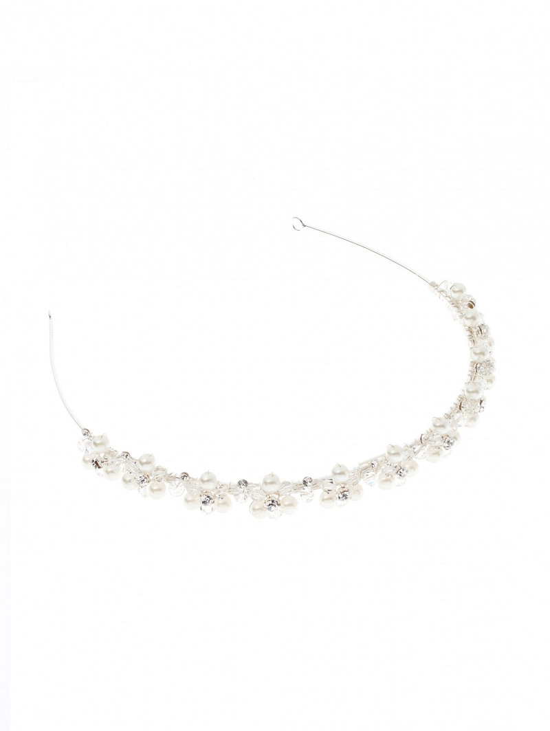 - Tiara con base plateada, perlas, pedrería y cristales color marfil
