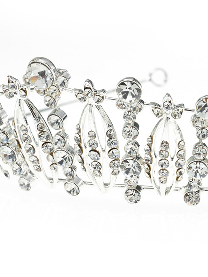 - Esta tiara de color plata consiste en piedras strass que se incorporan en un hermoso motivo real en esta tiara. La tiara es la joya perfecta para completar el look de tu boda, especialmente cuando eres una novia que busca un ambiente romántico. Esta tiara color plata se puede usar tanto en el cabello como en el velo.