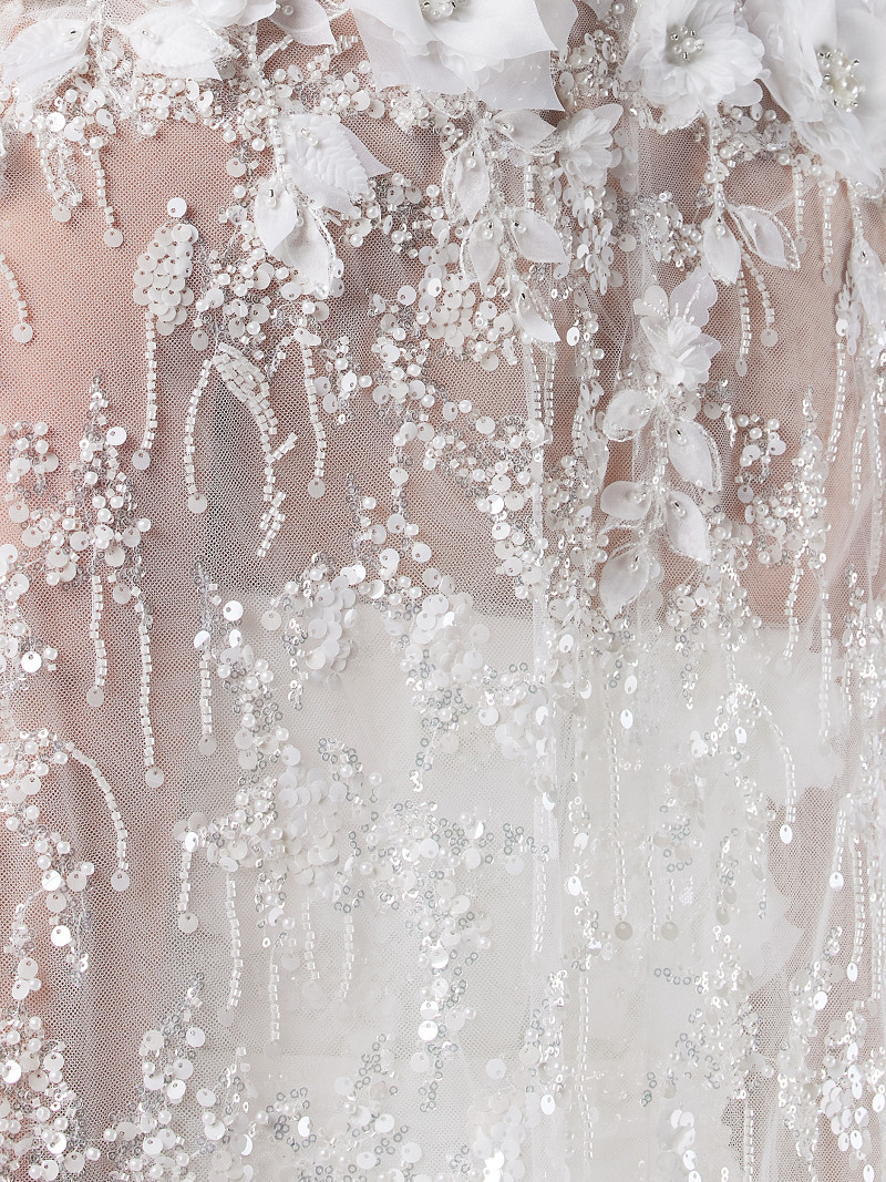 - Décorée de fleurs 3D, de perles, de sequins et de perles.
