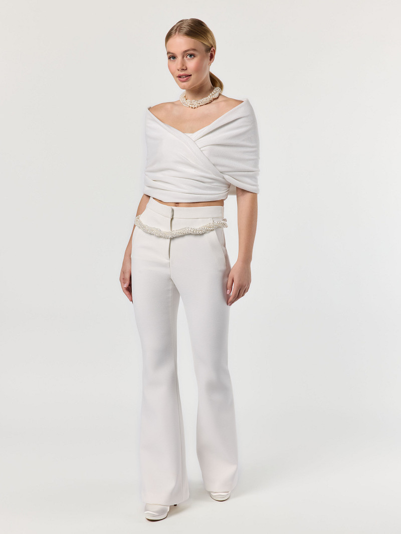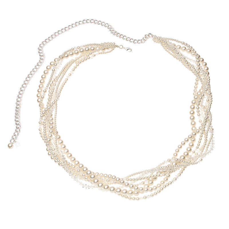 - Des perles et des cristaux mats de couleur ivoire et une chaîne de couleur argentée.