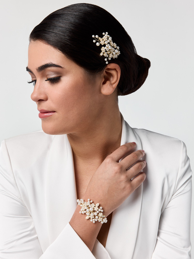 BB-75022 – Épingle à cheveux avec de jolies perles et feuilles mates et brillantes de couleur ivoire