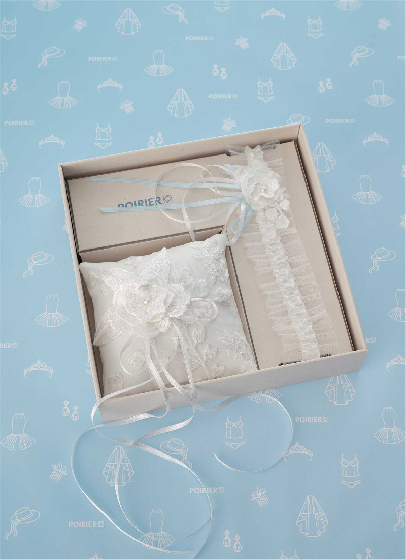 - Ensemble composé d'un petit coussin alliances et d'une jarretière de la Collection GEM de Poirier (GEM Collection).