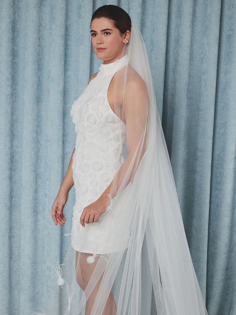 - Décoré d'organza appliqués avec des cristaux de Swarovski et des plumes d'autruche.