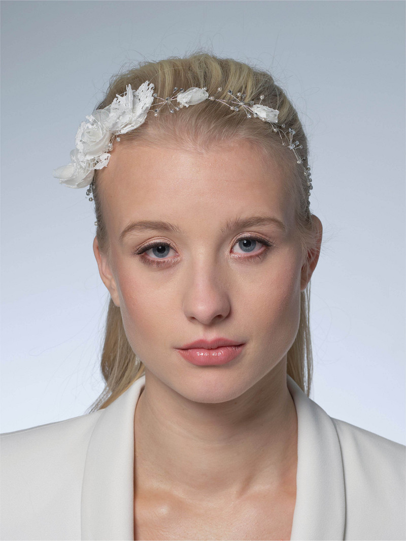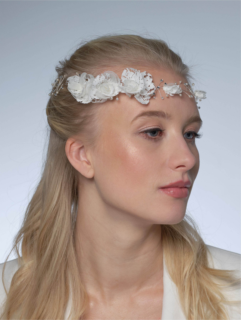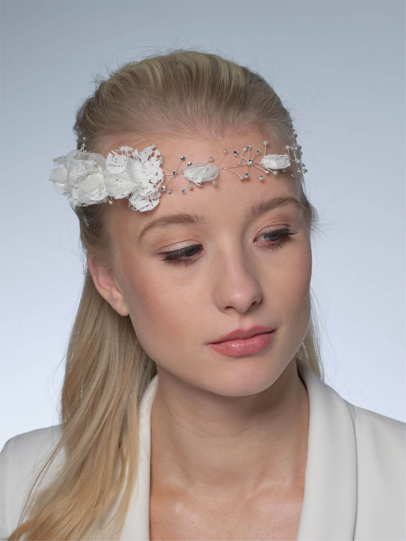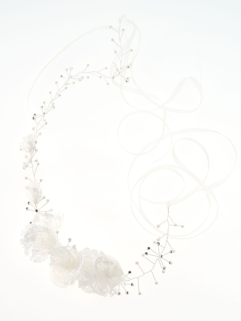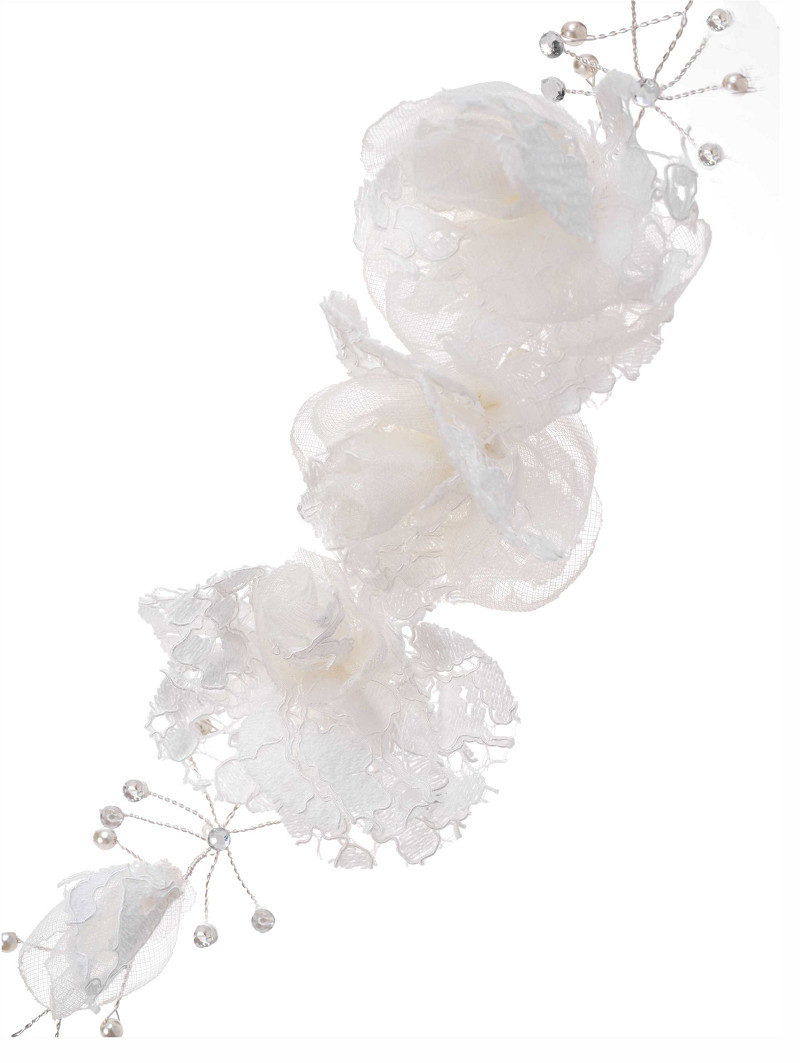 Haarband versierd met stoffen kanten bloemen, takjes met pareltjes en strasssteentjes