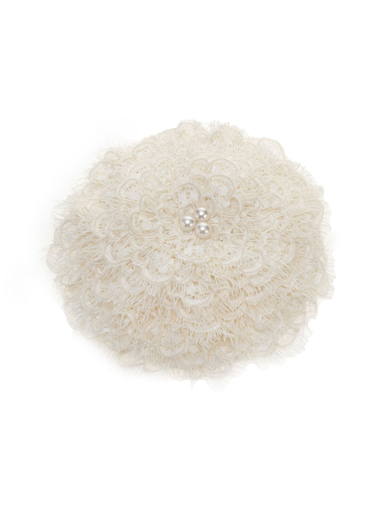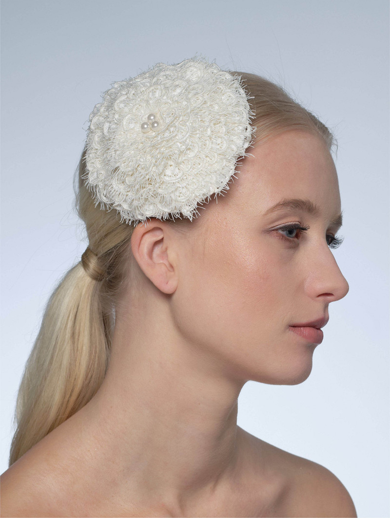 Fascinator met een ronde 3D look versierd met coupurekant en grote parels
