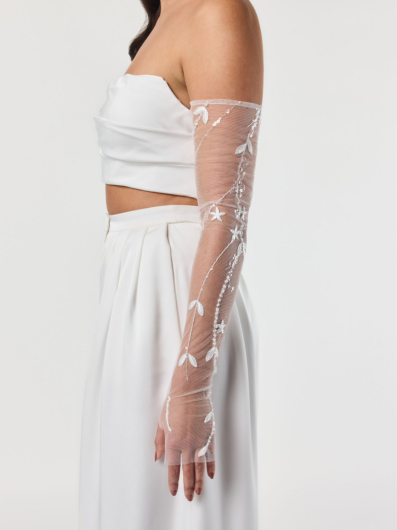 - Guanti lunghi senza dita in tulle elasticizzato di color avorio della Poirier Collection.