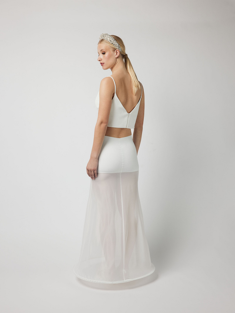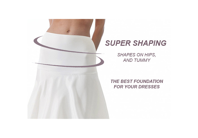 - La parte intorno ai fianchi viene prodotta con un tessuto modellante appositamente sviluppato, che è facile da tagliare per consentirti di creare una scollatura profonda sulla schiena o per accorciare la sottogonna, se necessario.