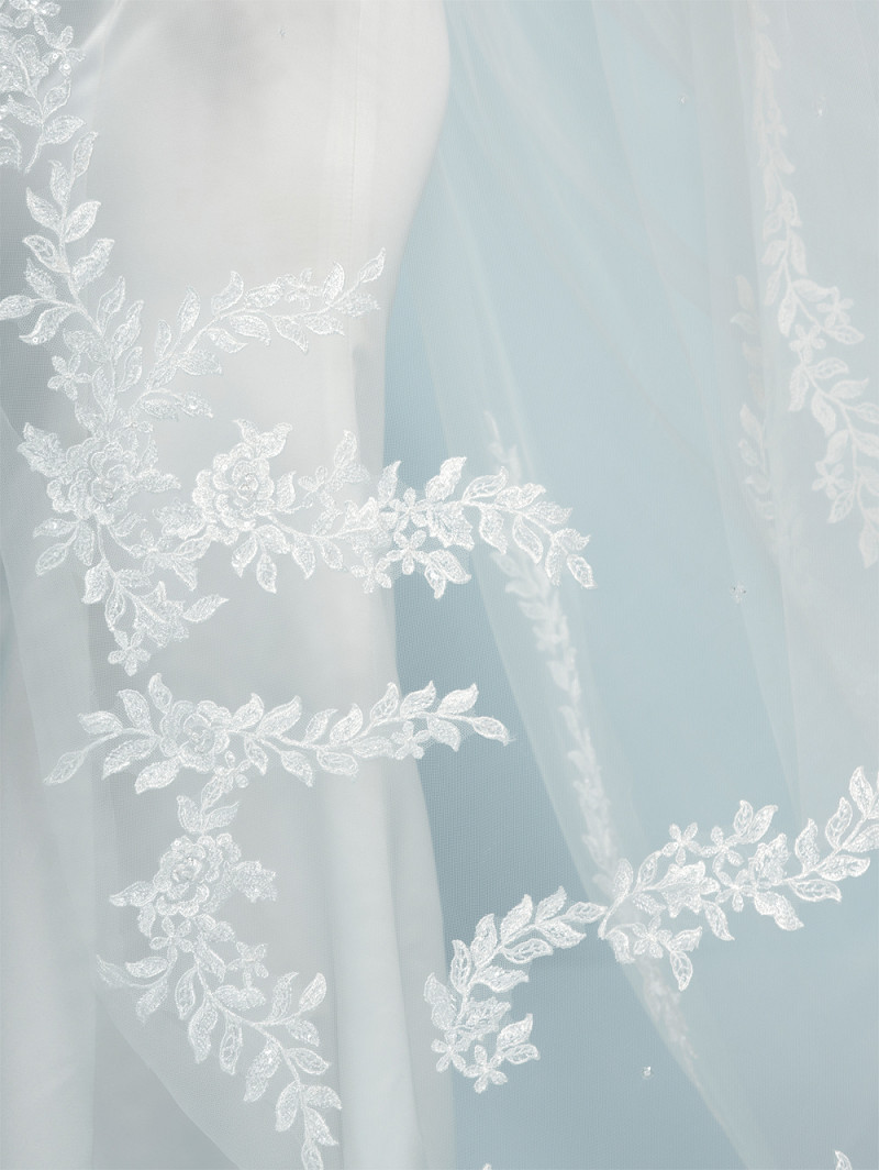 - Single-layer ivory-colored soft-tulle veil with lace applications, crystals, and sequins