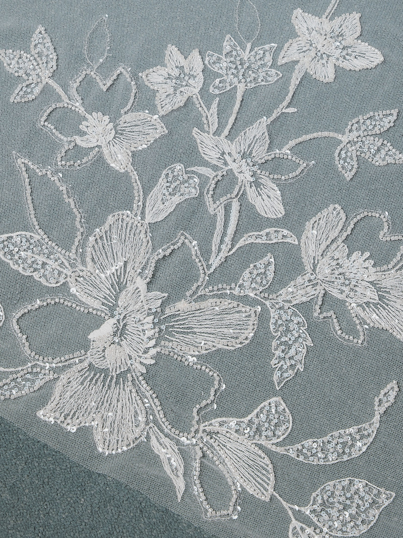 - Bordo ricamato con perline e paillettes, impreziosito da fiori in 3D.