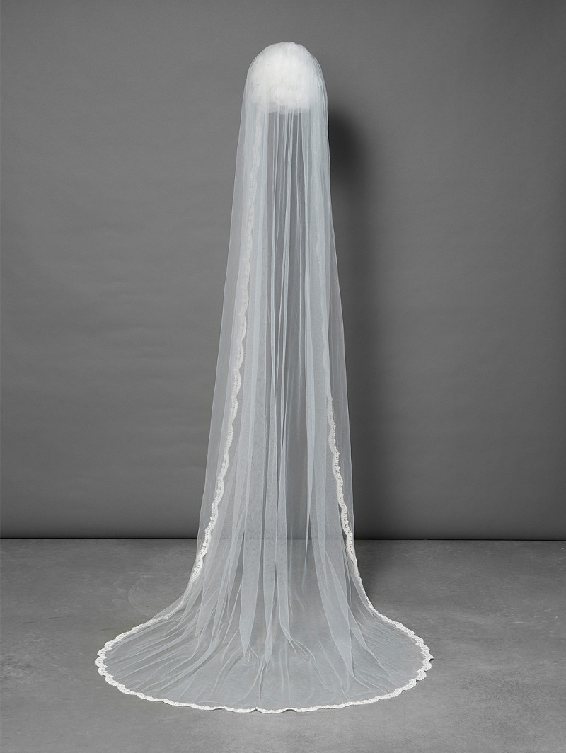 Single-layer veil in soft tulle, finished with a narrow scalloped lace edge adorned with pearls and sequins. Length 280 cm.Also available in other lengths.