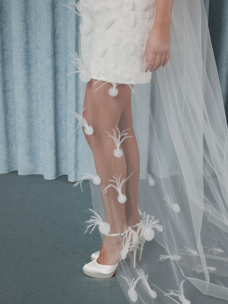 - Impreziosito da applicazioni in organza con cristalli Swarovski e piume di struzzo.