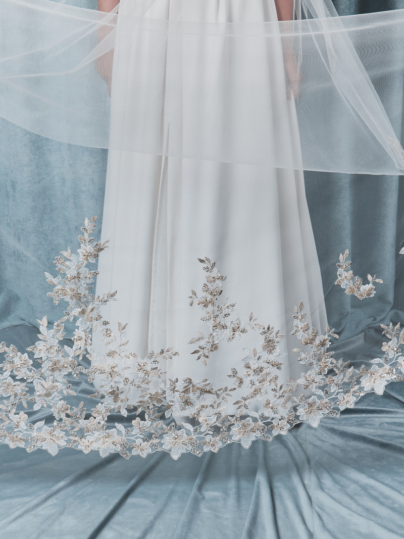 S75517-300/1/MD – Magnifico velo composto da uno strato di tulle medio-rigido, impreziosito da un ricamo dorato/avorio, paillettes e perline
