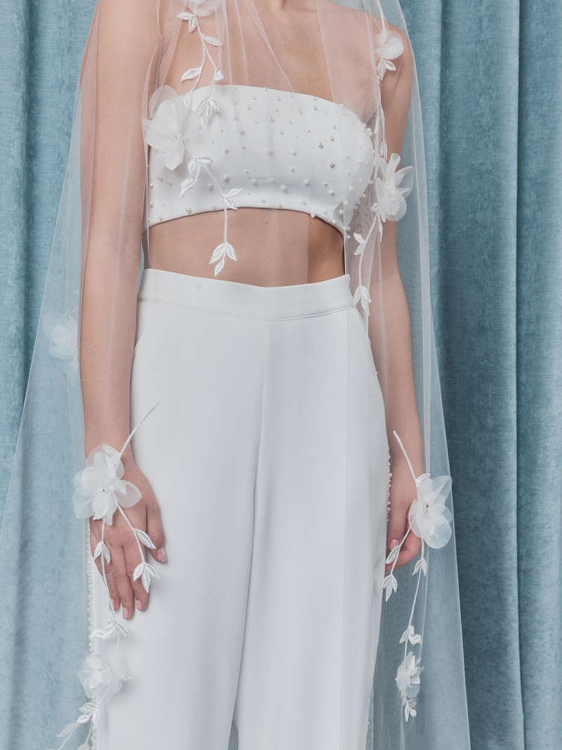 - Impreziosito da un ricamo, fiori in 3D e strass.