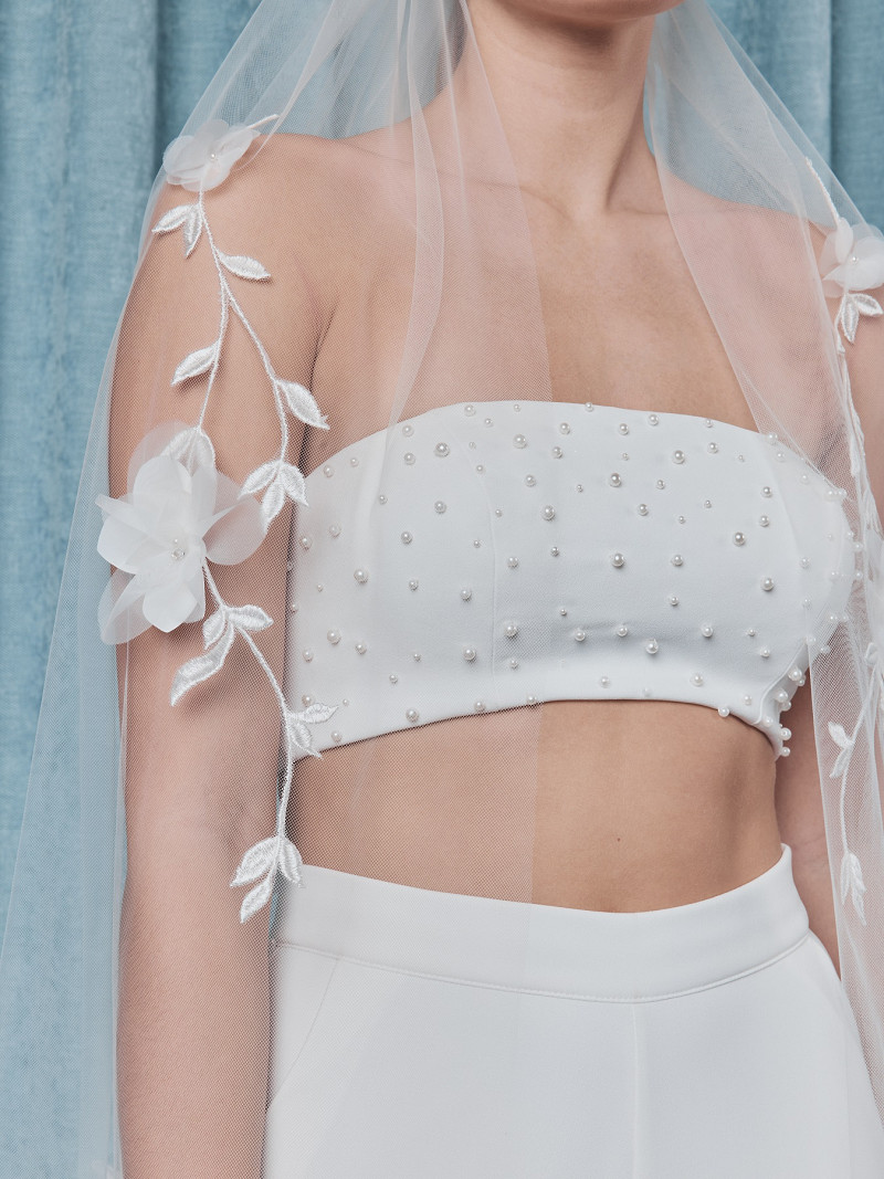 S75530-300/1/MD – Velo composto da uno strato di tulle con un raffinato ricamo e fiori in 3D