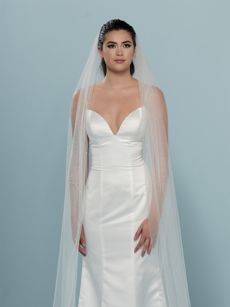 - Single-layer ivory-colored veil that is fully embellished with crystals and rhinestones