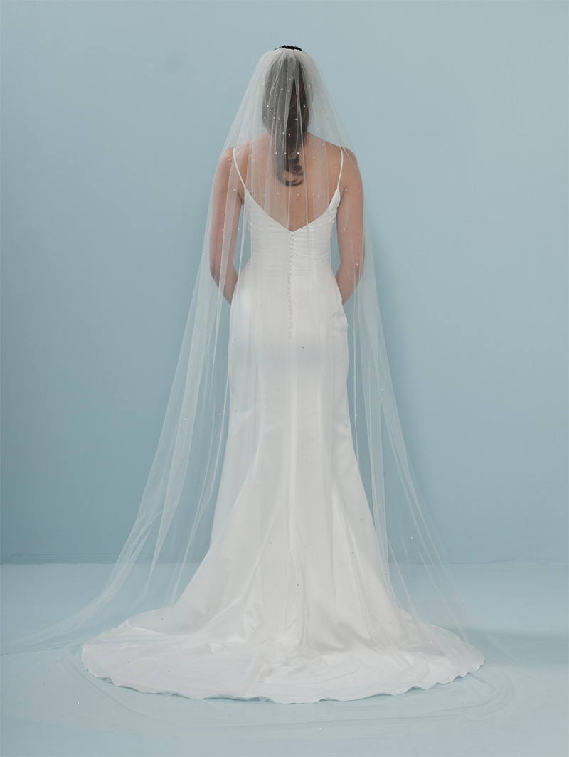 - When you are a bride that soars on trends this particular veil will fancy your interest. This veil is made of single-layer soft-tulle, and it is fully decorated with crystals and rhinestones, to make sure that you sparkle during you special day. The applications on this veil start on top of its comb, and they are divided all over this item. The length of this veil is 300 cm (118.1 inch).