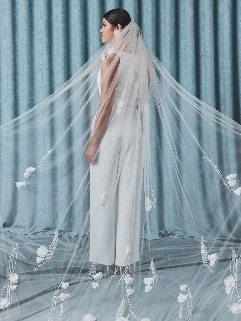 S75516-300/1/SF – Elegante velo composto da uno strato di tulle morbido, interamente impreziosito da fiori in 3D e perline
