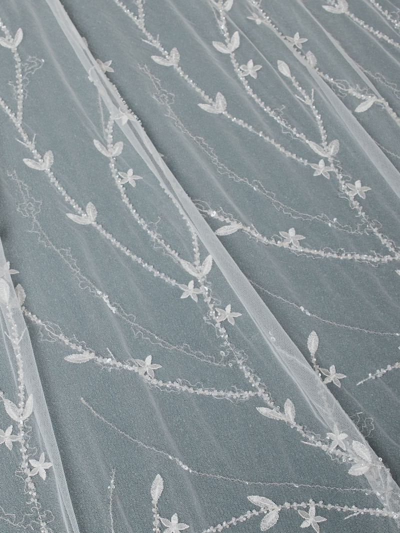 - Ricamato con paillettes che creano una fantasia a foglie e rami.