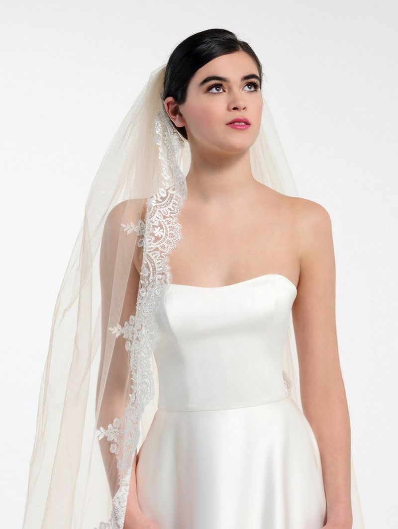 - Make sure to choose bridal veil S360-350?1?Med of the Romantic Collection of Poirier. This veil is made out of single-layer medium tulle. Next to this, the veil is decorated with an embroidered flower pattern with sequins, but also a scalloped rim with embroidered lace with sequins. This bridal veil has a length of 350 cm (137.7 inch). This specific veil is available in different colour combinations: