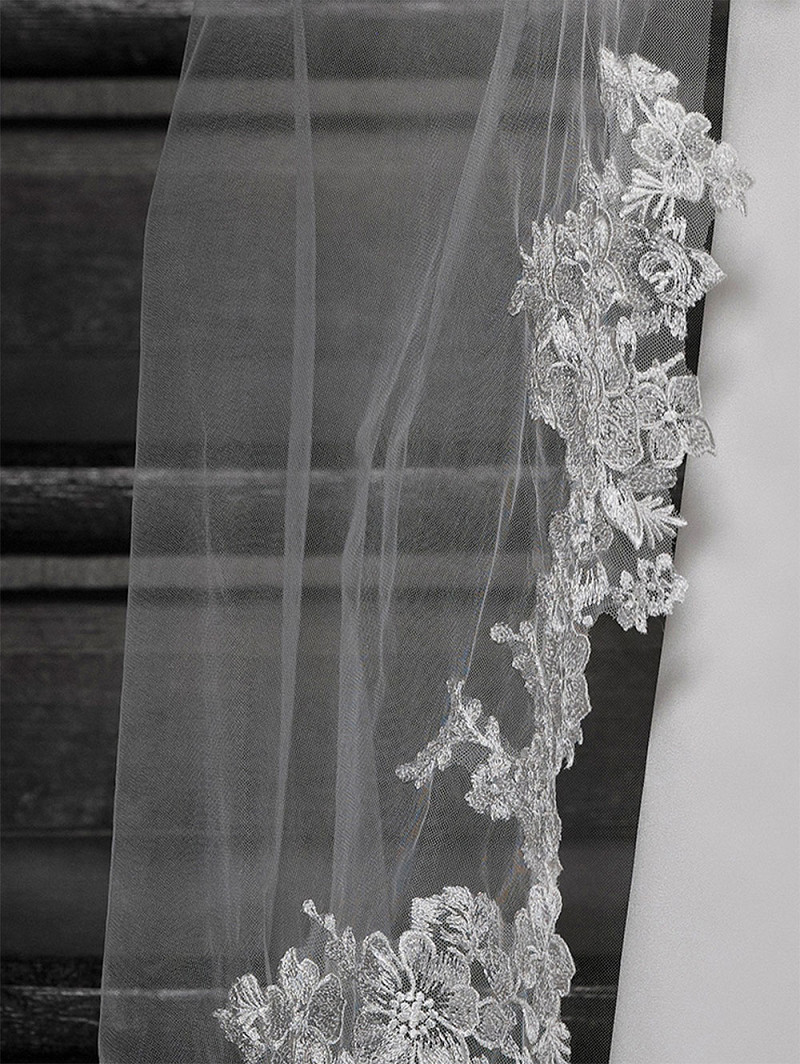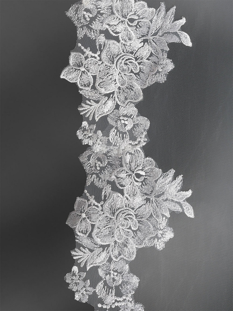 Single-layer veil in medium tulle with a border of an embroidered floral motive. Length 350cm.