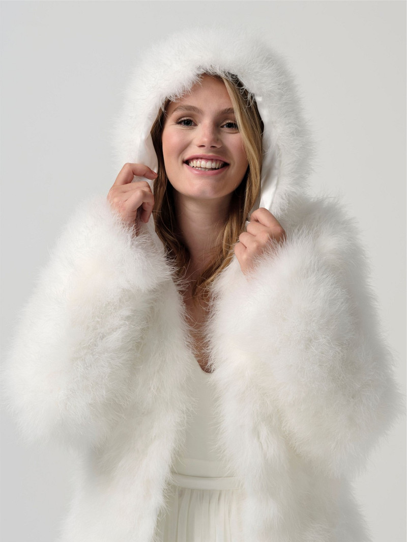 • Kenmerken: lange jas met capuchon gemaakt van echte maraboeveren, satijnen voering, verkrijgbaar in de kleur ivoor of blush, lengte: 105 cm, heeft een haak- en oogsluiting
