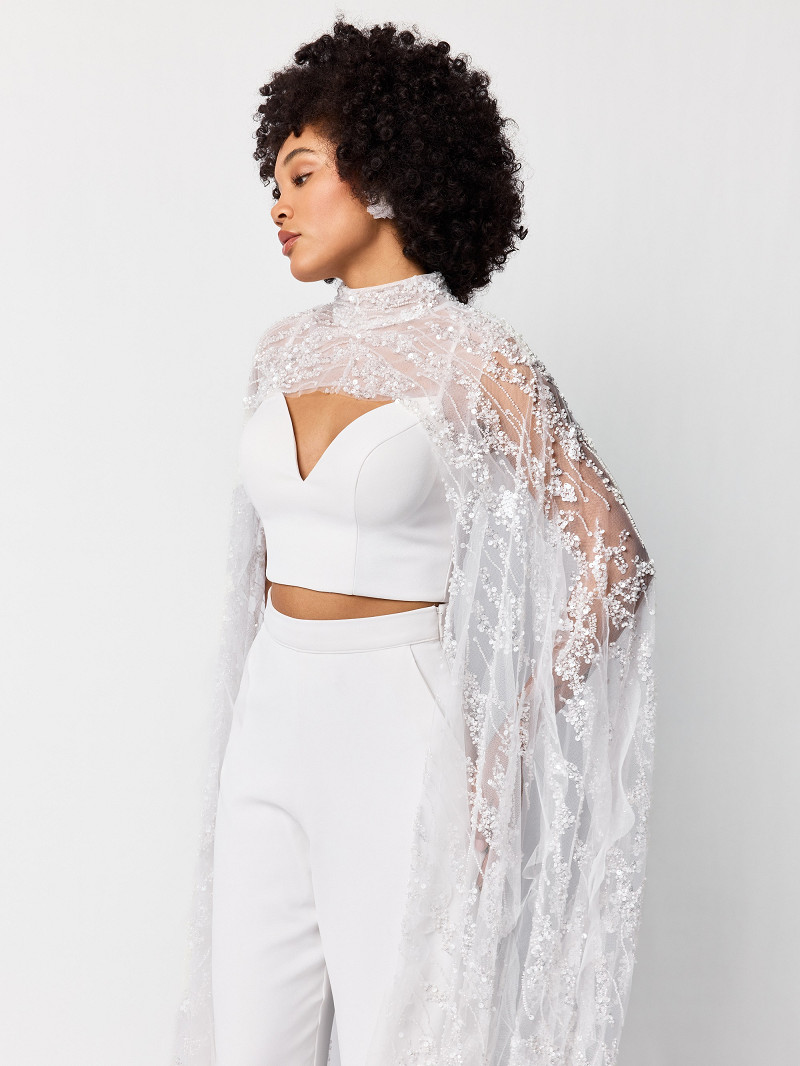 C-75101 - Rijk gedecoreerde tule cape versierd met pailletten, kraaltjes en pareltjes