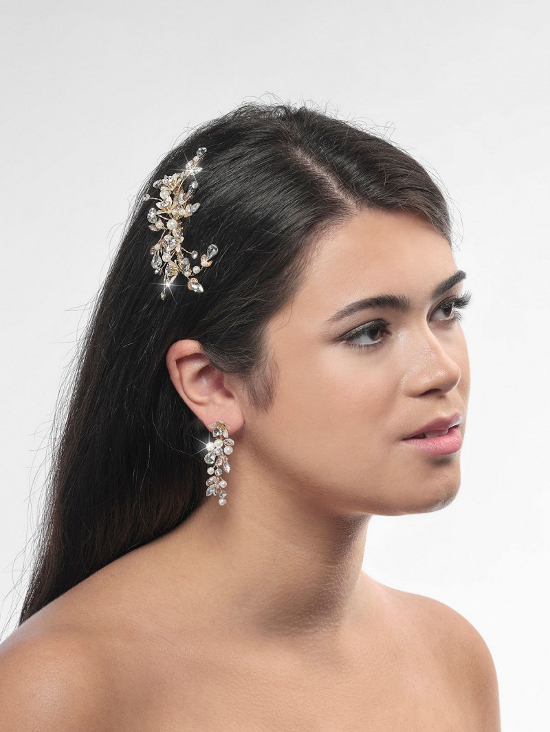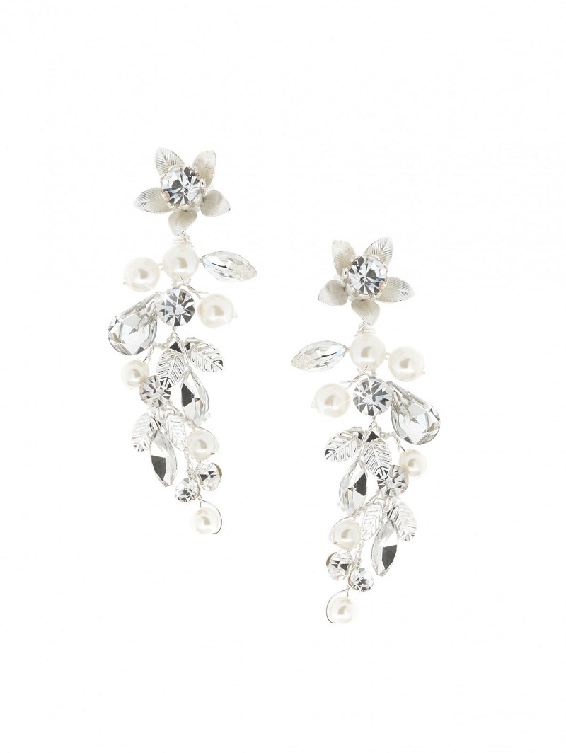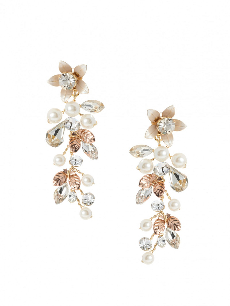 Oorbellen in de vorm van een takje met blaadjes en bloemetjes van pareltjes en strasssteentjes
