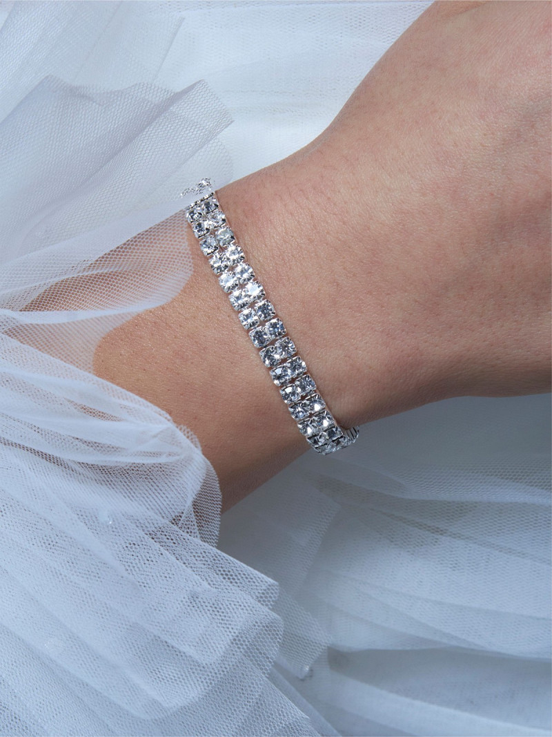 Kies voor een juwelenset die zowel fashionable als krachtig is en voor een moderne bridal look die een blijvende indruk zal achterlaten. De verschillende elementen van deze set zijn gemaakt van zilver en bezet met schitterende zirkonia. De halsketting uit deze set is een choker, hetgeen betekent dat deze dicht op de hals wordt gedragen. Deze bijzondere juwelenset van Poirier heeft twee paar oorbellen, waarvan één bestaat uit stekers met strasssteentjes en de ander een paar hangoorbellen is die eveneens strasssteentjes als versiering hebben. Deze set bestaat uit ware statement pieces. Zowel de armband als de halsketting zijn voorzien van een hangertje met het monogram van Poirier.